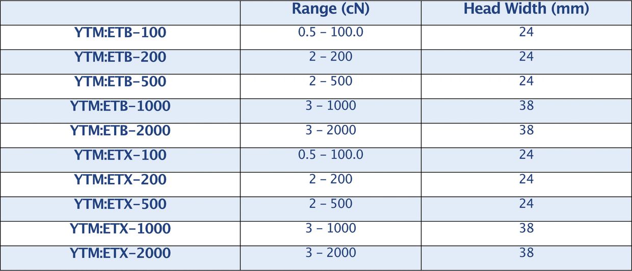 Two models available, the ETB is the basic unit for many applications, the ETX provides detailed process data and analysis with interface for PC connection. The meter has storage of AVG, MIN, MAX and PEAK tension values which can be recalled in the display. Adjustable electronic damping can be used for better reading when tension is constantly changing. The meter has a display update time of 0.5 seconds and is CE approved (tested for electromagnetic compatability). Display can be reversed for right hand or left hand use.