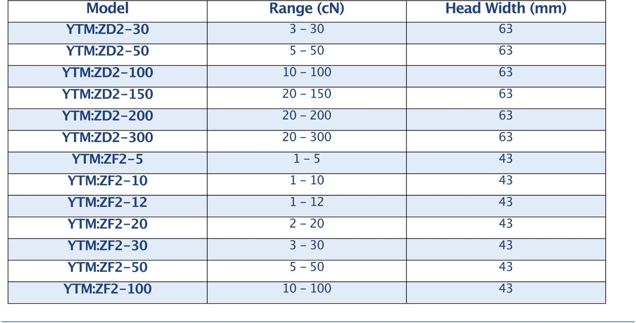 This light weight device is available in two models. The ZD2 has bigger rollers for universal use and the ZF2 has a slim filament guide with small guide rollers, ideal for limited access space. The Z Series Tension Meter is popular in the textile industry, with an analog display for low tensions. The tension meter shows changing and fluctuating tensions fast and enables an optimal process adjustment. The housing is made of high- strength plastic. Inspection certificate with calibration report optionally available.Conforms to DIN EN 10204.